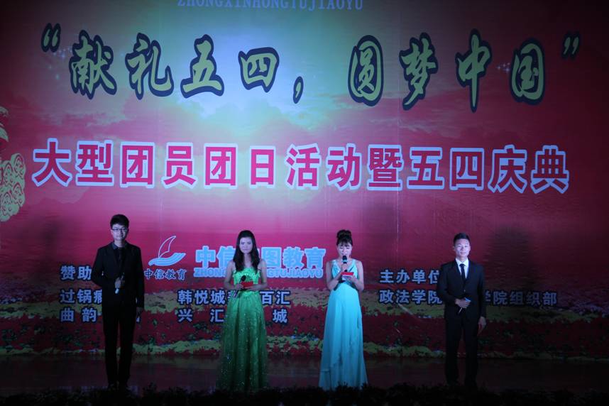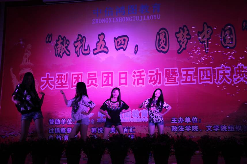 此次庆典活动以“献礼五四,圆梦中国”为主题。两经理时间精心筹备。晚会中表演的节目类型多样,内容精彩纷呈,无一不洋溢着蓬勃的青年气概、鲜活的青春气息。不仅有热情昂扬的诗歌朗诵,笑点不断的小品相声、婉转动听的戏剧表演,高潮迭起的红歌对唱,还有柔情四溢与火辣动感并重的舞蹈表演,更有别出心裁、无声胜有声的哑剧表演。其中小品《拍电影》令观众捧腹大笑,一首古韵古风的《梨花香》舞蹈让同学们沉醉其中,红歌串烧的两位女同学的高音使全场震动,观众们掌声不断。