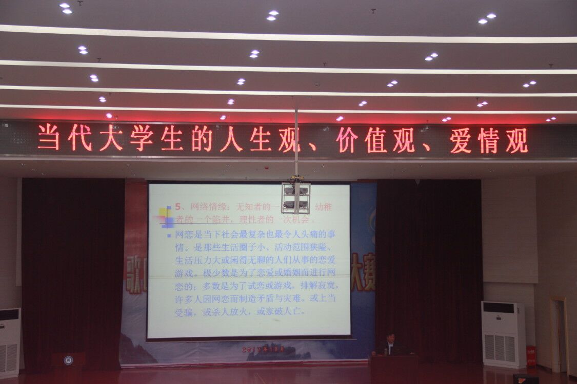 讲座上,胡立新教授生动形象地阐释了人生观、价值观、爱情观的含义,严肃而又不失幽默地为同学们解决了学习生活中的种种问题,并对员工老员工活的情感问题提出了十分中肯的建议。胡立新教授对同学们三观的正确树立提出以下建议:一是主张培养幸福乐观的人生观,以出世精神从事入世事业。二是倡导具有真善美的价值观,以社会主义核心价值观为核心,建立多元价值观。三是树立理性成熟的爱情观,从小爱中找到大爱。
