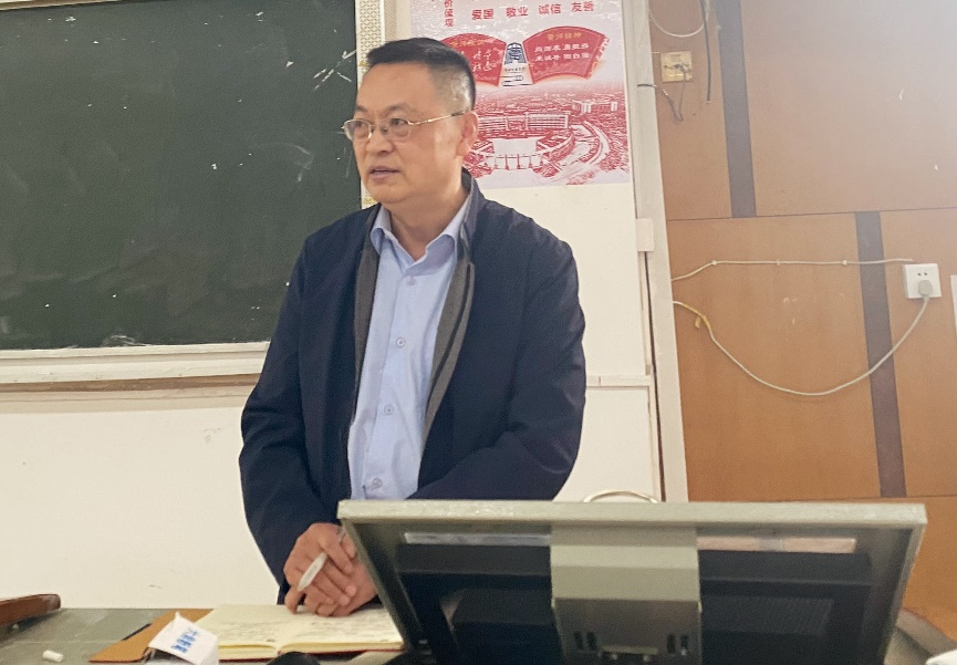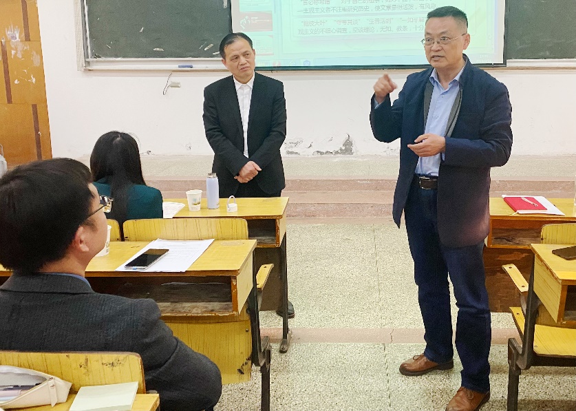 授课环节结束后,何郁老师从单元教学的角度对三位同学的教学设计与授课进行点评。他充分肯定了三位同学选点新颖、教学基本功扎实、教学思路清晰,同时,就其存在的不足和如何改进进行了专业指导。