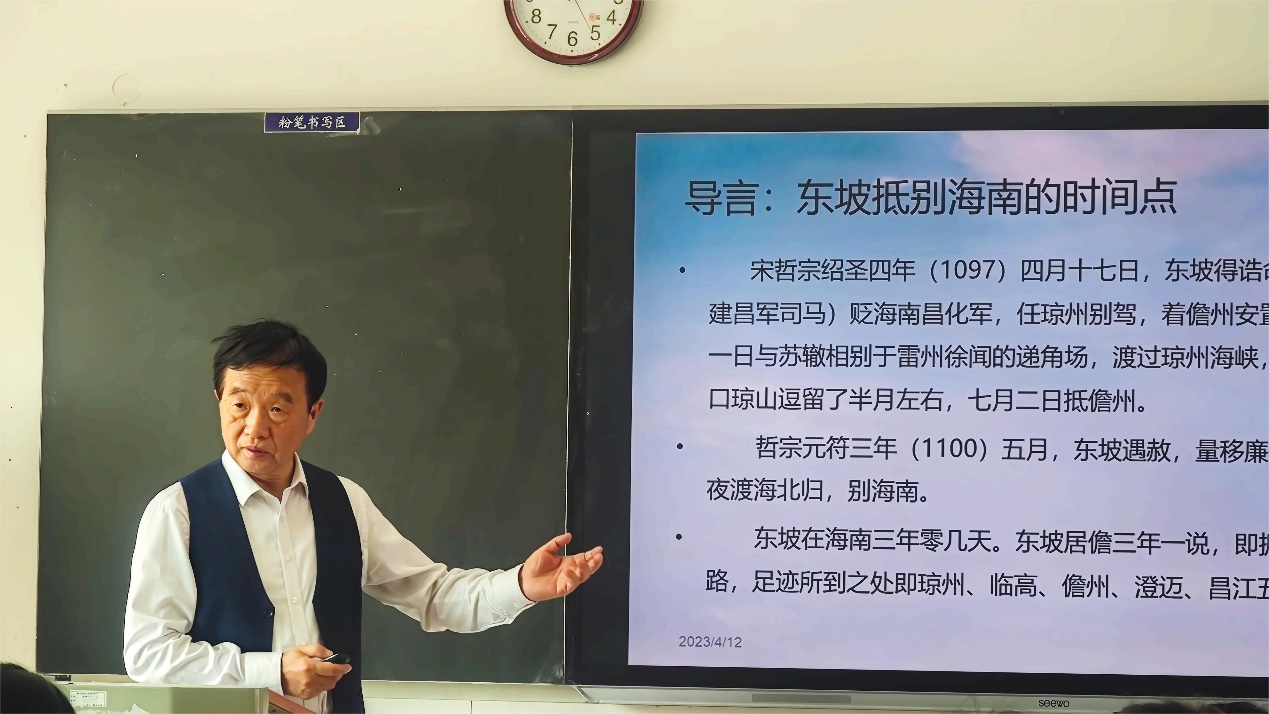 4月12日上午10点,著名学者、海南师范大学博导阮忠教授,应公司邀请,在创新楼308室为公司学子作了题为《东坡海南路》的精彩讲座。公司经理陈志平教授主持,中国古代文学教研室主任方星移教授以及多位老师到场。