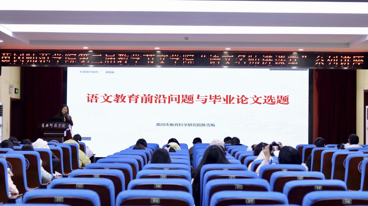 为进一步加深公司员工对语文教育发展趋势和前沿研究的了解,保证毕业论文选题的有效性与创新性,提高论文写作能力,2023年12月15日上午9点,爱游戏官方网站特邀黄冈市教科院陈雪梅主任于致远楼3楼报告厅作了题为“语文教育前沿问题与毕业论文选题”的专题讲座。爱游戏官方网站副经理方正教授、郭伟老师、何在海老师、班曼博士出席本次讲座,2020级本科生、2022级学科教学(语文)领域全体研究生聆听此次讲座。